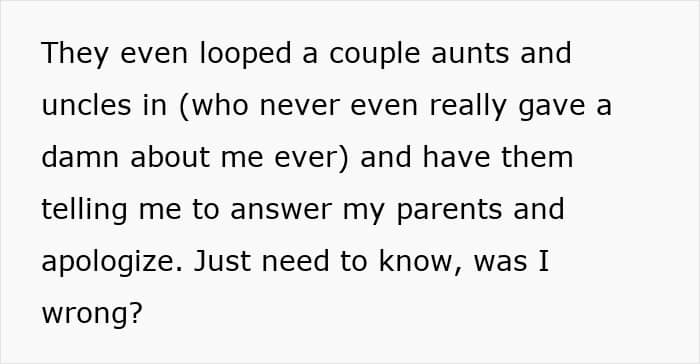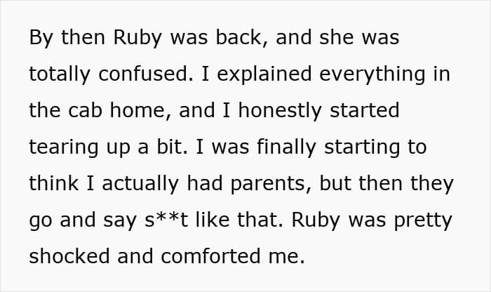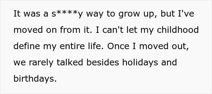 Now, these aren’t warm-and-fuzzy, fresh-baked-cookies kind of parents. Nope, these are the “we paid nannies to raise you” type. The kind who missed most of the OP’s childhood but have been trying to squeeze back into her life after decades, claiming regret. And just when she was cautiously beginning to let her guard down, they went and blew it spectacularly.