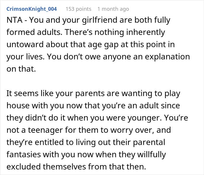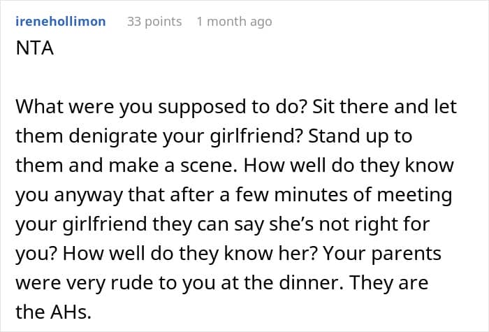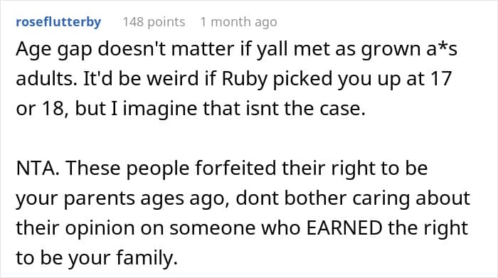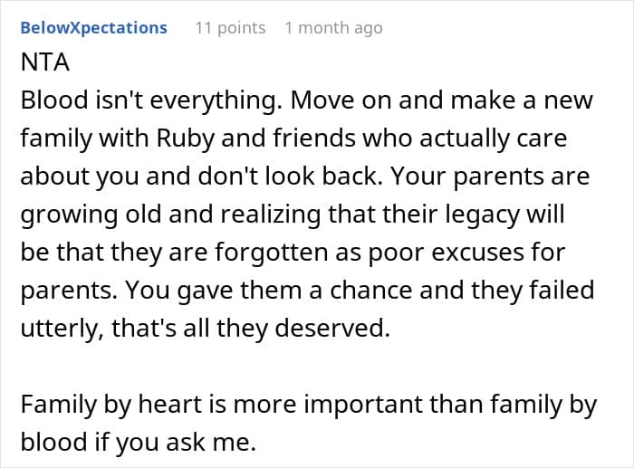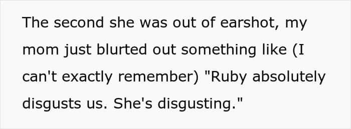 The second Ruby was out of earshot, the OP’s mom launched a verbal grenade, declaring Ruby “disgusting” and making it crystal clear they weren’t about to support the relationship, like their opinion actually mattered after decades of neglect. What followed was an awkward silence so thick you could cut it with a steak knife. Our OP didn’t yell or cause a scene – she simply paid the bill like a boss and dipped.