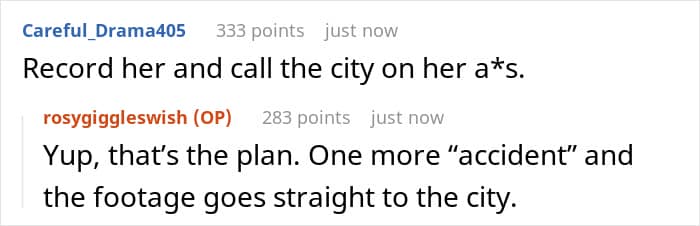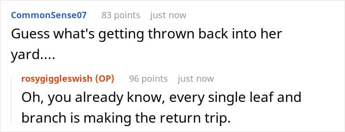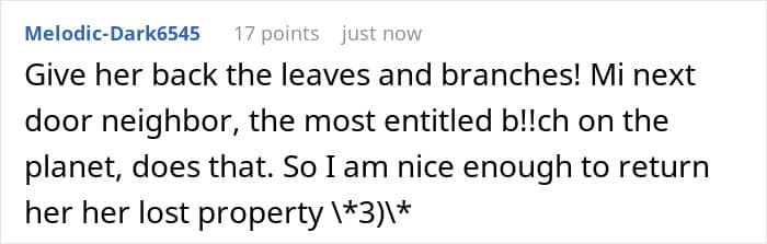 Leaves and branches began mysteriously appearing in the OP’s yard. Then came the cherry on top of the fence – Linda, on a step ladder, trying to peek over. When confronted, she didn’t even pretend it was innocent. She claimed that the OP’s “selfishness” was forcing her to such extremes. Well, that’s a new one for me.