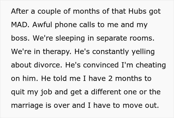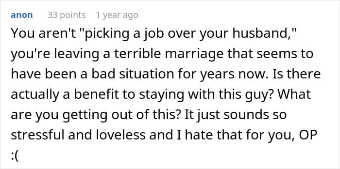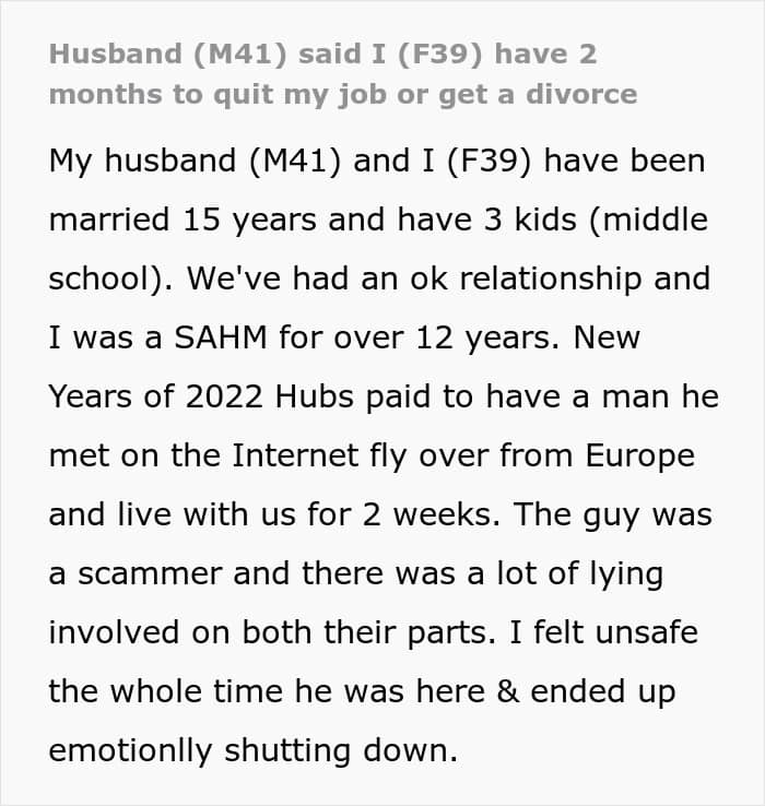 However, the woman’s husband had been growing increasingly dissatisfied with it. So much so that he even issued her an ultimatum: either quit or the marriage is over. She pushed back, but he wouldn’t drop it, which led the woman to post her story on the internet and ask strangers to help her decide what to do next.