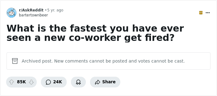 There’s a good reason why a probation period exists for new hires. It acts as a ‘test run’ that is beneficial for both sides. During it, the employee can make sure that the company aligns with their goals and lives up to their expectations, while the employer reduces the risk of poor hires and ensures a good fit. Despite the mutual benefits, though, sometimes it happens that new hires are dismissed during the probation period, some even at record speeds, and for the most ridiculous reasons ever. We gathered some of the fastest and craziest new hire firing instances from this popular thread below that are bound to make you feel better about your own performance at work. Scroll down to check them out for yourself, and don’t forget to upvote those dismissals that were totally deserved.
