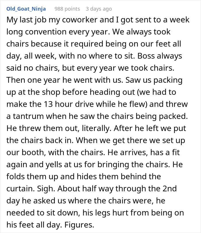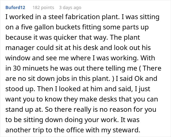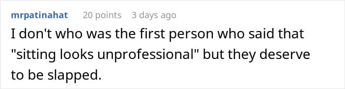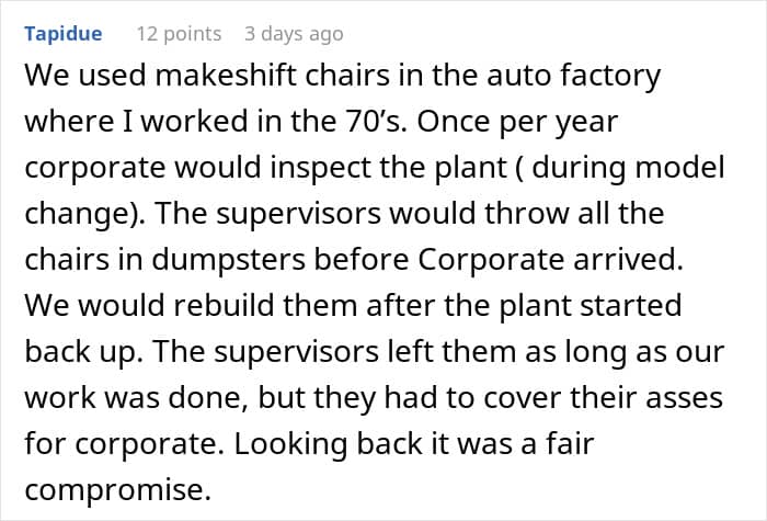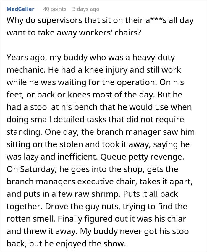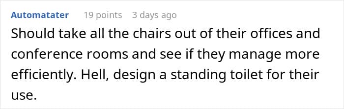 “Then they should schedule a calm, professional chat with their manager (or HR), present the evidence, and propose a trial of a hybrid approach: “Let’s do a two-week pilot where I alternate sitting and standing, track my comfort, productivity, and any posture-related complaints, and revisit the policy afterward.” Framing it as an experiment takes the emotion out and focuses on data. If they can demonstrate equal or better performance and fewer aches, it’s hard to justify a blanket ban on chairs.”