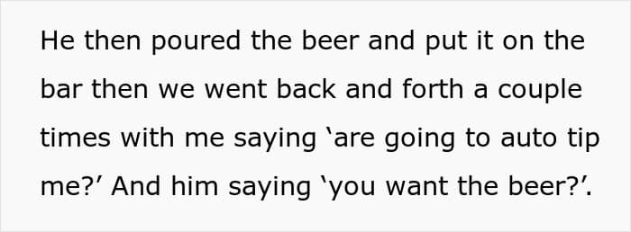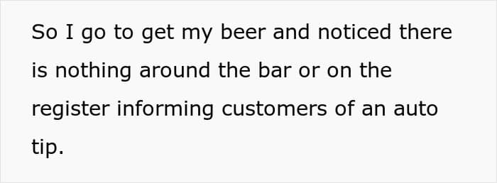 While the OP doesn’t mind leaving a tip for good service, they weren’t equally in favor of the ‘auto tip’ the bartender added. It will likely come as no surprise that the Redditor is far from the only one feeling this way about it; according to the Pew Research Center, the majority—as much as 72%—of US adults say they oppose businesses including automatic service charges or tips on customers’ bills, no matter the size of their party. People in the comment section didn’t seem to be too supportive of the bar’s tipping policy, either.