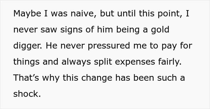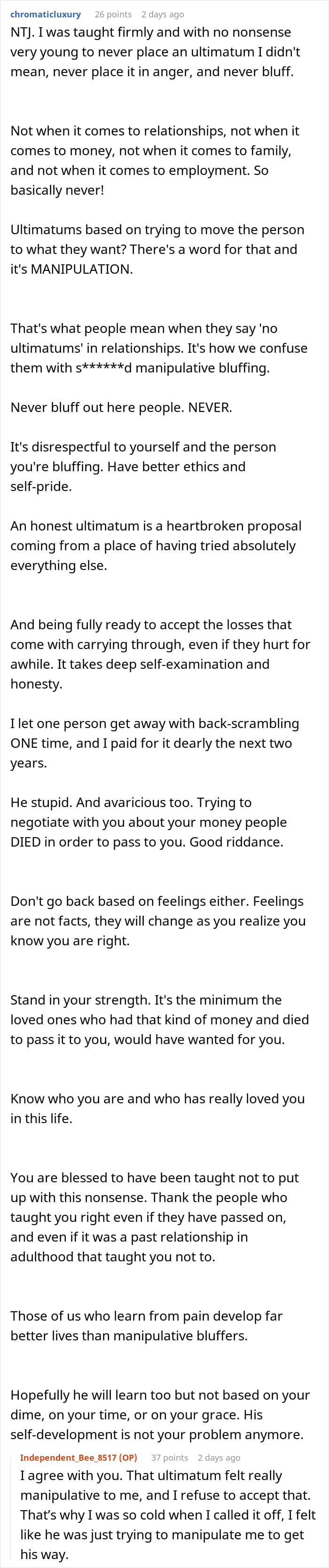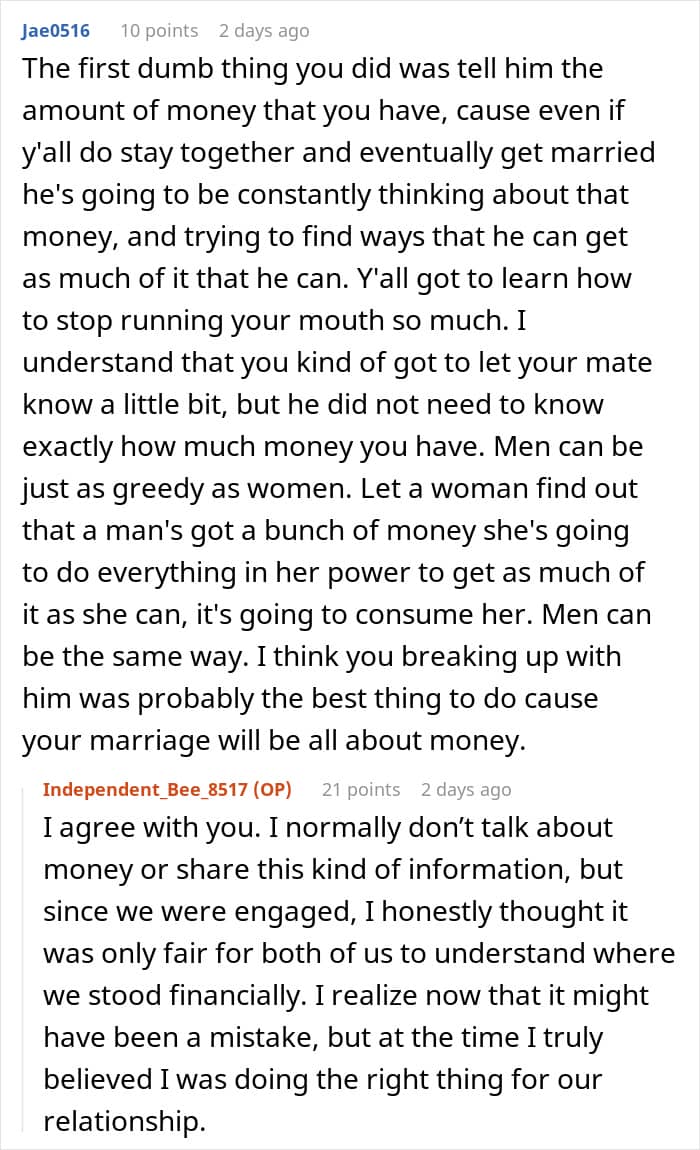 Netizens sided with the OP, praising her for protecting her finances and refusing to give in to her fiancé’s ultimatums. They framed his behavior as manipulative and opportunistic, and also pointed out that financial disputes are a major cause of relationship breakdowns and that she avoided long-term regret by setting boundaries.