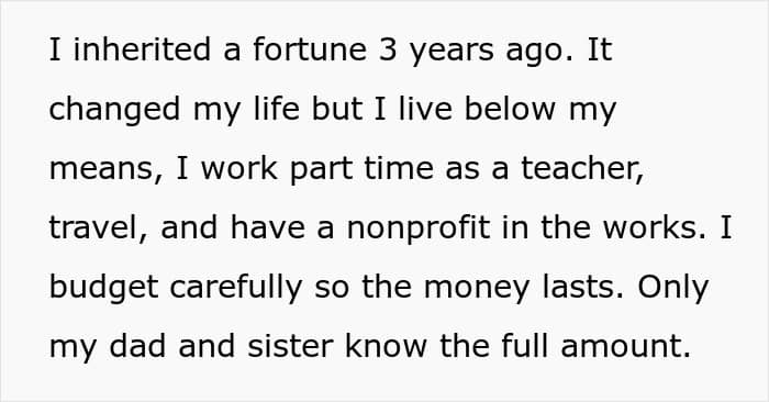 The OP inherited a fortune three years ago, but she didn’t let it define her lifestyle. She works part-time as a teacher, budgets carefully, travels, and even runs a nonprofit. Only her closest family knows the full extent of her wealth. However, she’s disciplined when it comes to her money and lives below her means.