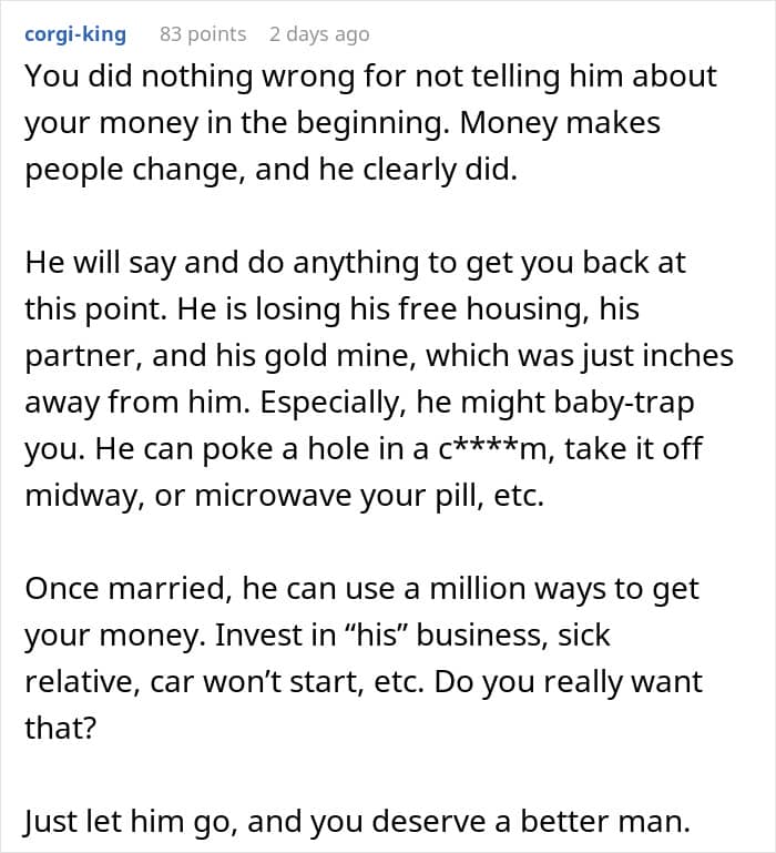 She chose to protect her finances, ending the engagement and asking him to move out. He accused her of prioritizing money over love, but she felt he had crossed a boundary by demanding she bankroll their life together.