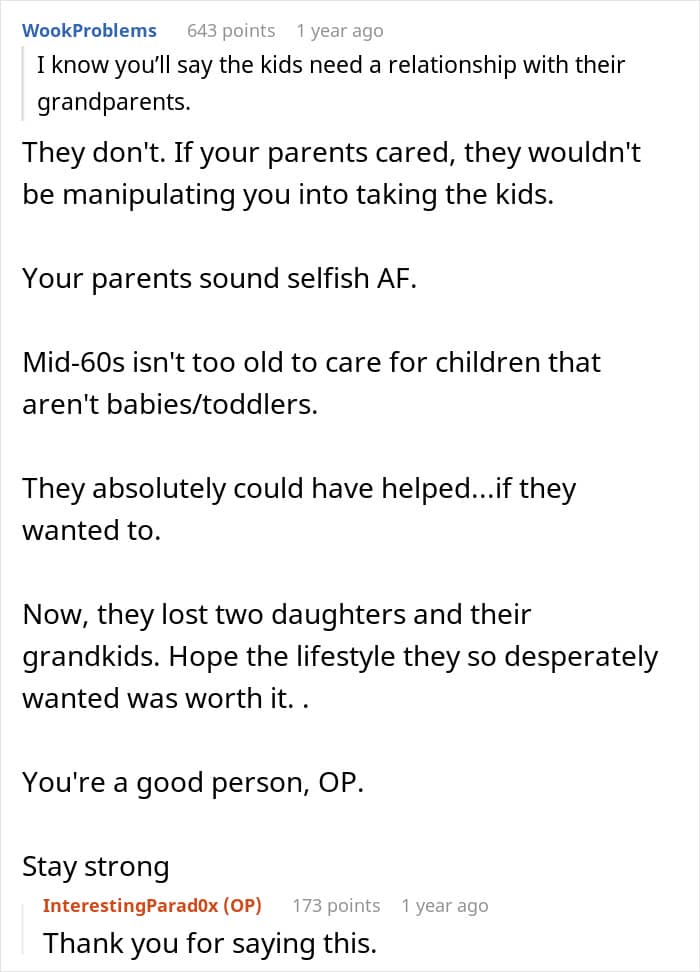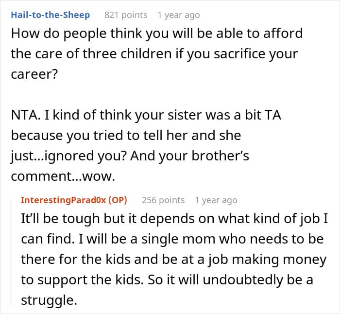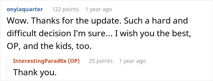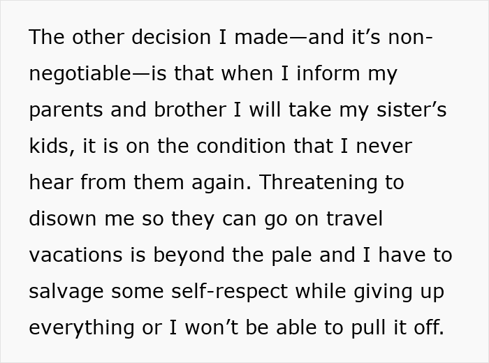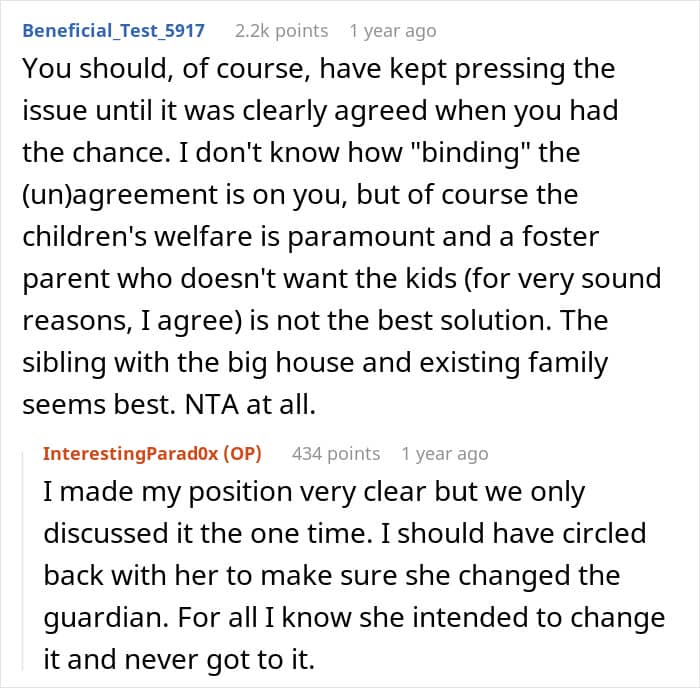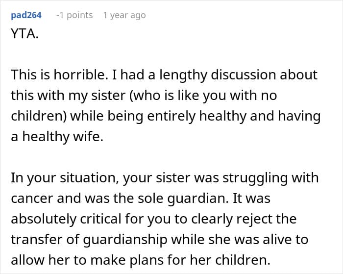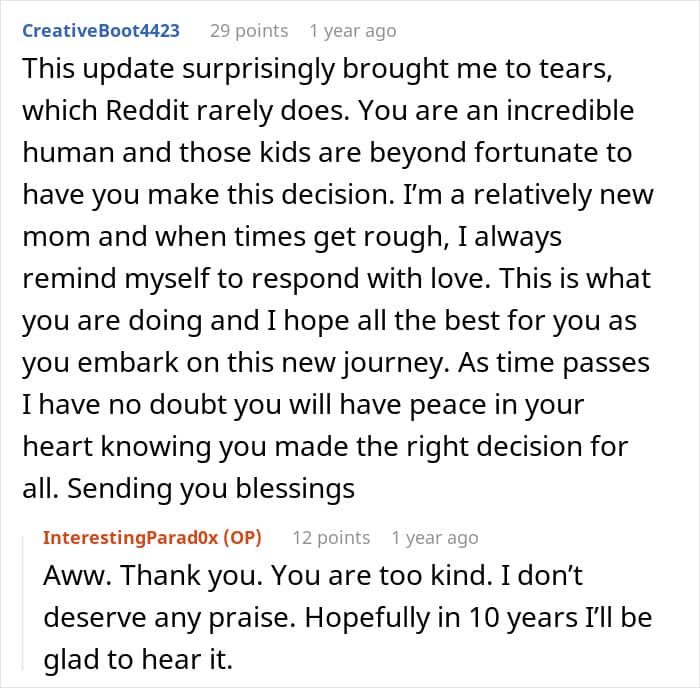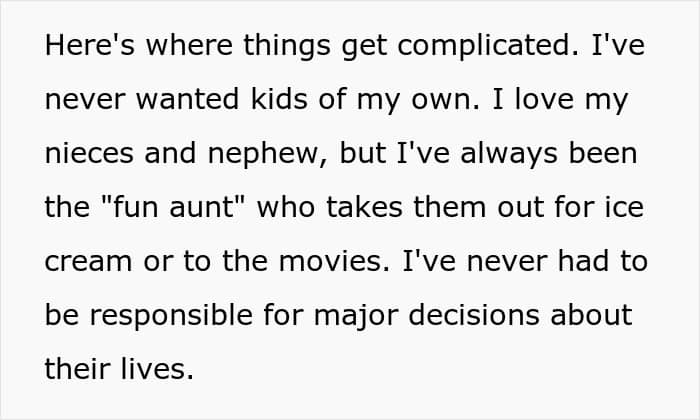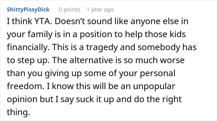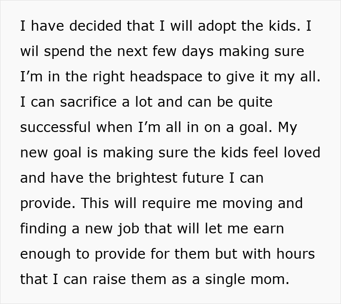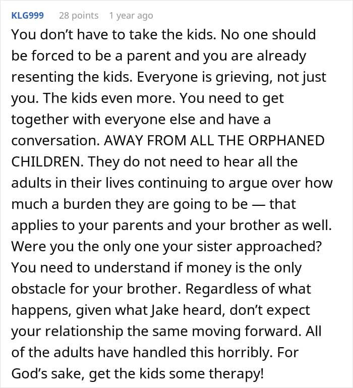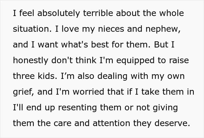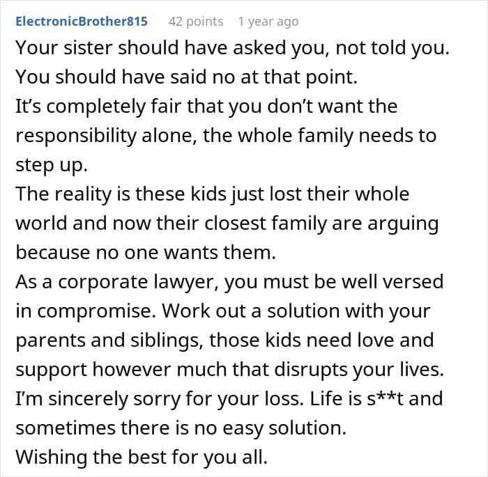 In the end, the decision is all about heart versus reality. The motivation for adopting your late brother’s children stems from love, obligation, and sacrifice. The reasons against this stem from integrity, reality, and giving the children the care they deserve. Both choices are not simple and both come with future consequences. Most vital is that the choice, to assume guardianship or to stand aside and serve in some other role, is made with clarity, integrity, and above all, for the benefit of the children. If you were curious about what happened next, you’re in luck, as she shared two whole updates below.