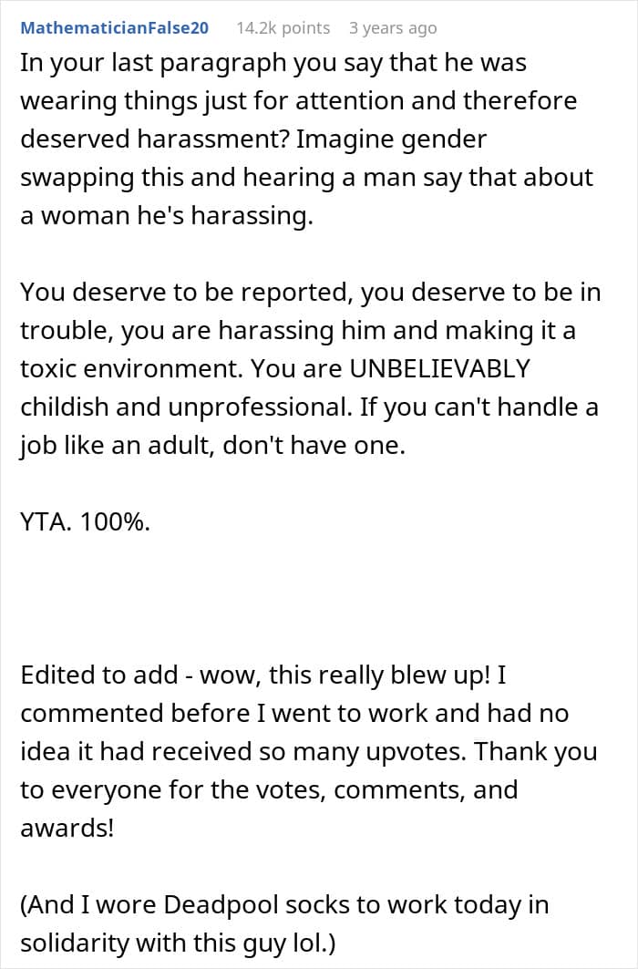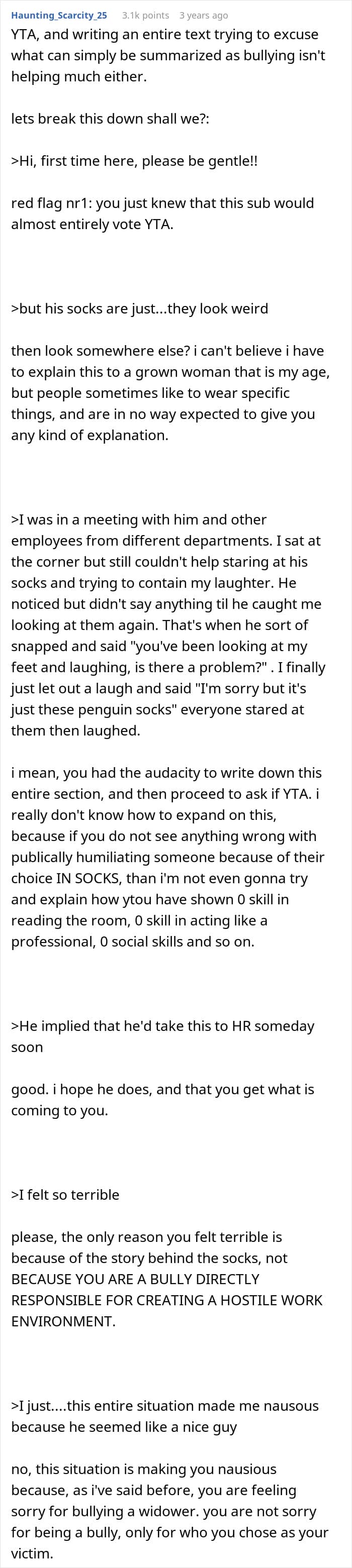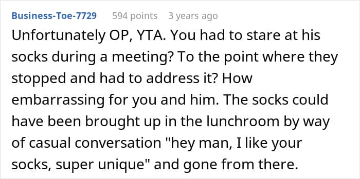 Netizens condemned the OP’s behavior, labeling it as harassment, bullying, and deeply unprofessional. They insisted that mocking a colleague in a meeting crossed the line, especially once the personal meaning behind the socks was revealed. They also highlighted the toxic culture created by involving coworkers in the ridicule.