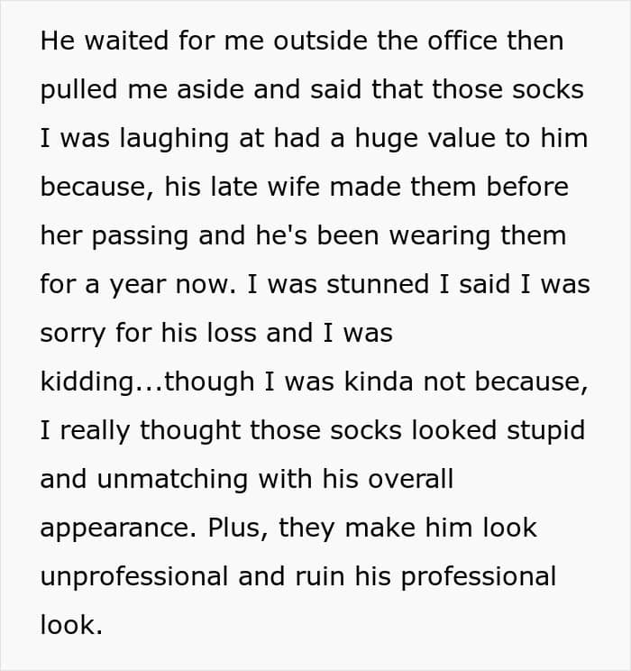 The entire room turned to look at his socks and roared with laughter, leading to an undeniably awkward atmosphere afterward. The colleague, embarrassed but composed, went back to business. After the meeting, the colleague waited outside and pulled the OP aside, revealing that the socks were hand-knit by his late wife before her passing.