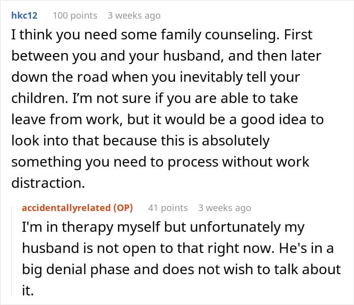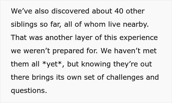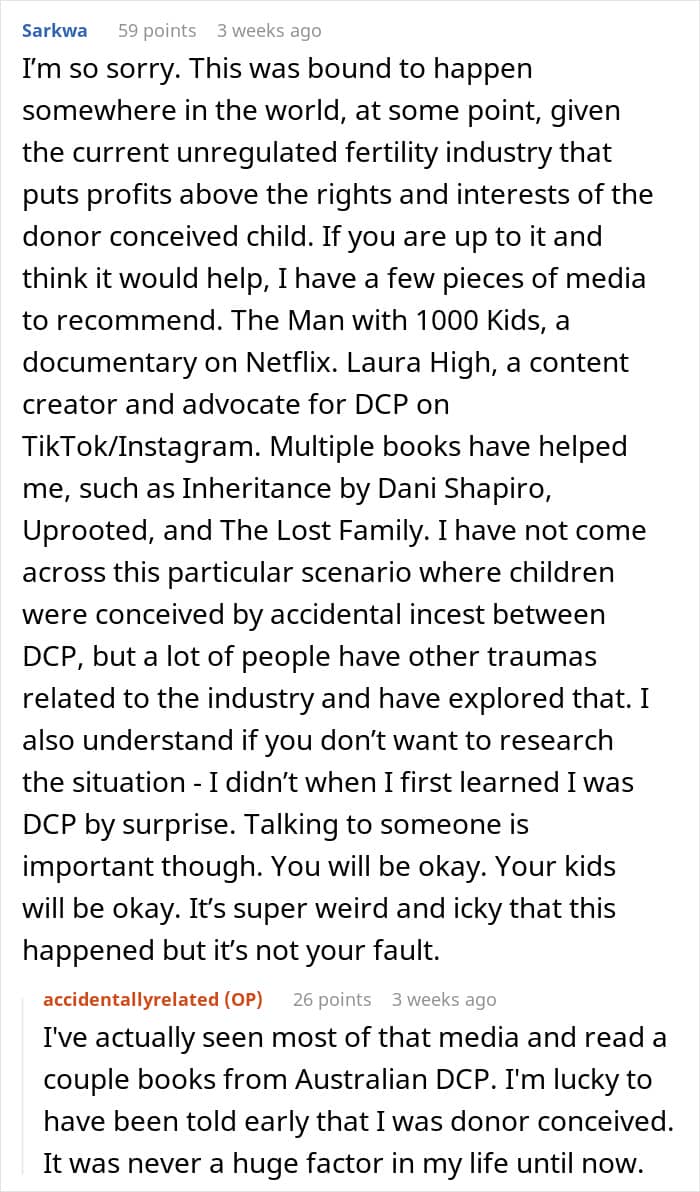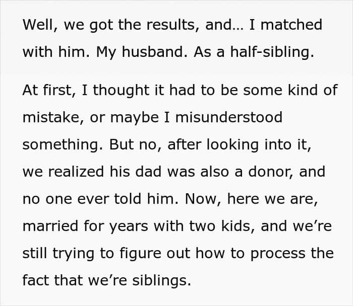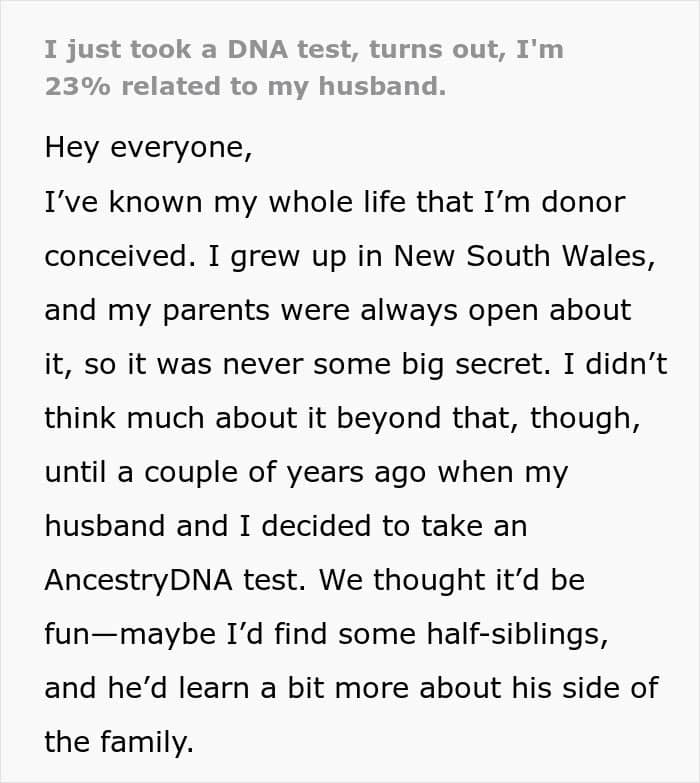 If you need proof that life can be stranger than fiction, then this woman’s story is it. Last month, she turned to the subreddit ‘Donor Conceived‘ to share a discovery that would shake anyone’s sense of self: a DNA test taken on a whim supposedly revealed a life-altering connection between herself and her husband. Turns out, they’re not only romantic partners but also half-siblings. The news raised so many difficult questions about personal identity and family that she really needed someone to relate to through this unexpected experience.