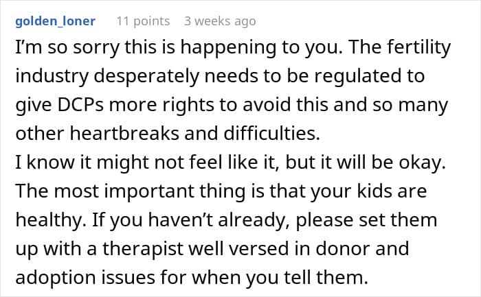 Some places have policies to lower the chances of something like this happening. While anonymous donation, in which the donor’s identity is not available to the donor-conceived person, is common in the US and Canada, many European countries, including the United Kingdom, Germany, Norway, and others, require that the donor’s identity be disclosed when the donor-conceived person comes of age (typically 18). And there’s good reason behind this.