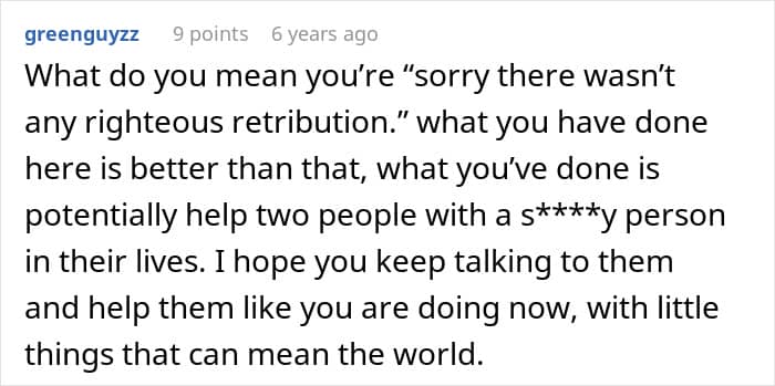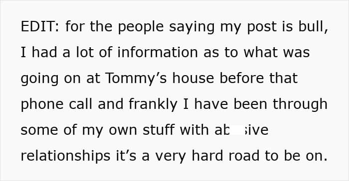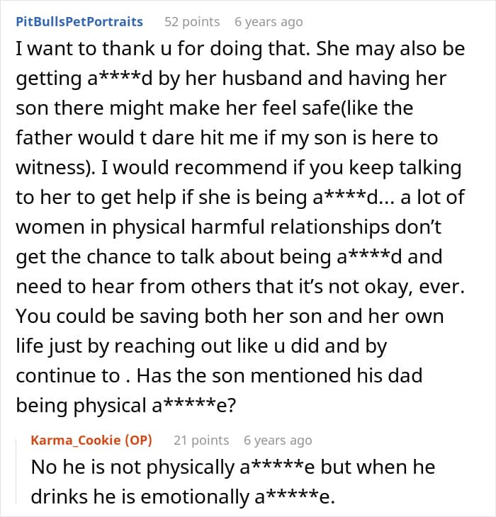 Instead of going on the assumption that the other mother was entitled and a Karen, the Redditor was able to think about the time she herself experienced a bad relationship and correctly guessed that something similar was happening to “Tommy’s” mother.