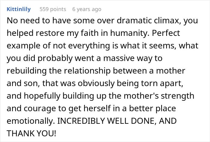 In this case, the Redditor was able to think about why the mother was demanding “Tommy” stay at home more. She didn’t hang up on his mother, she didn’t yell at her, and she didn’t bring up their family situation in any petty or derogatory way. In offering to listen, she may have even helped the mother’s mental health immensely.