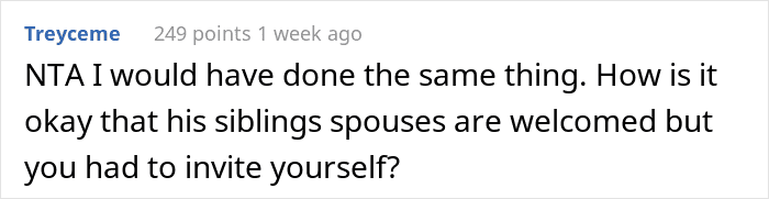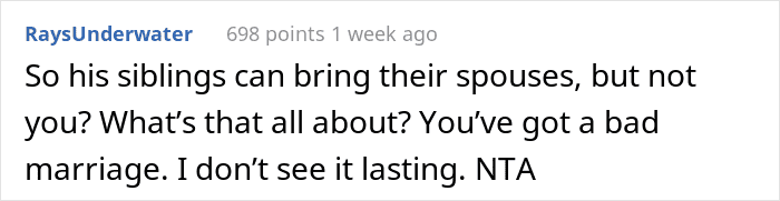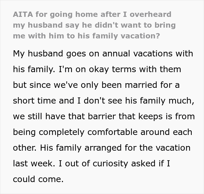 The OP began her post by revealing that her husband and his family go on annual vacations, and although she’s on “okay” terms with them, there’s still a barrier that keeps them from being completely comfortable around each other because they’ve been only married for a short period of time.