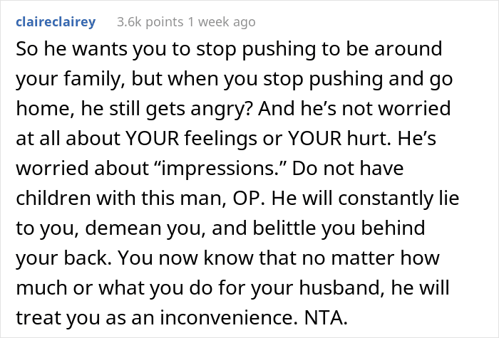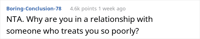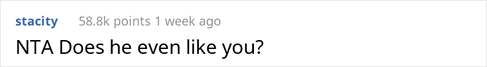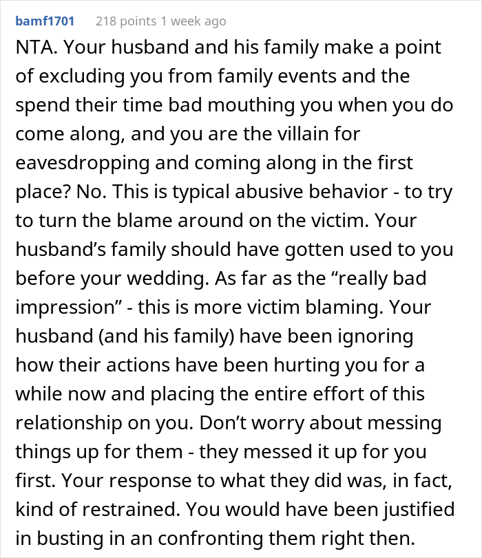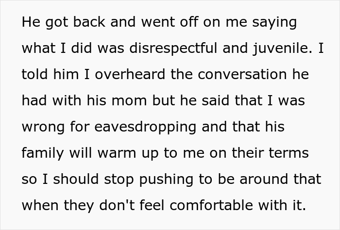 Once the man got back, he went off on the OP, arguing that what she did was “disrespectful” and “juvenile.” Of course, she told the truth about overhearing that rather insensitive conversation, to which he responded by slamming her for eavesdropping. He also added that his family would eventually warm up to her, she just needs to stop pushing the idea of being around them when they don’t feel comfortable, basically hinting that the woman was to blame for coming along in the first place.