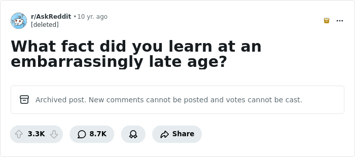 Someone asked, “What fact did you learn at an embarrassingly late age?” and thousands of answers came flooding in faster than Santa could come down the chimney. Some were hilarious cases of “lost in translation,”like a person thinking the Sistine Chapel was the “16th Chapel.” Others were more dramatic. Pure, unfiltered human cluelessness.