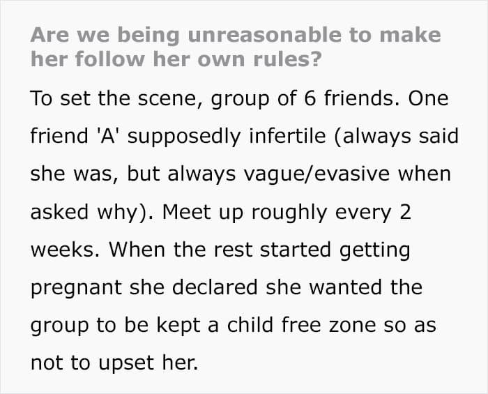 But despite how much you love your children, not everyone wants to hear about them. That’s why one friend group agreed that when they meet up, talking about kids is off limits. And this rule worked quite well, unless their “infertile” friend suddenly got pregnant. Below, you’ll find the full story that was recently posted on Mumsnet, as well as conversations with writer and parenting specialist, Pamela Li, and Sue Fagalde Lick, author of Childless by Marriage.