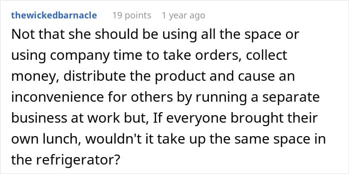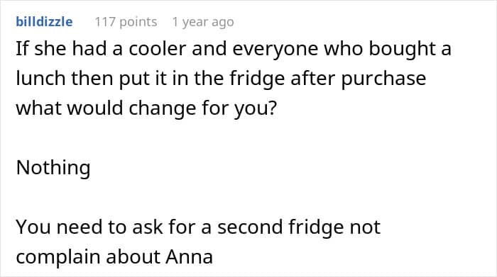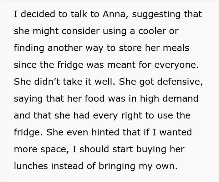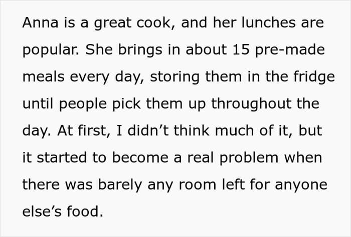 In a post on r/AITAH, they described the conflict that has been brewing between them and a woman from the office, “Anna,” who has been using the shared company fridge to store dozens of homemade meals, leaving little room for anyone else’s food.