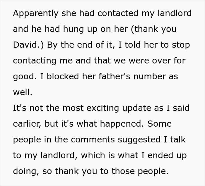 The landlord called him up, and they laughed over it, as she couldn’t do anything because the poster’s name was the only one on the lease. Well, that definitely must’ve been a relief for him. Sara tried to reach out again, but he blocked her and her family’s numbers as well. The poster also made sure to change his locks and got a camera installed by his door.
