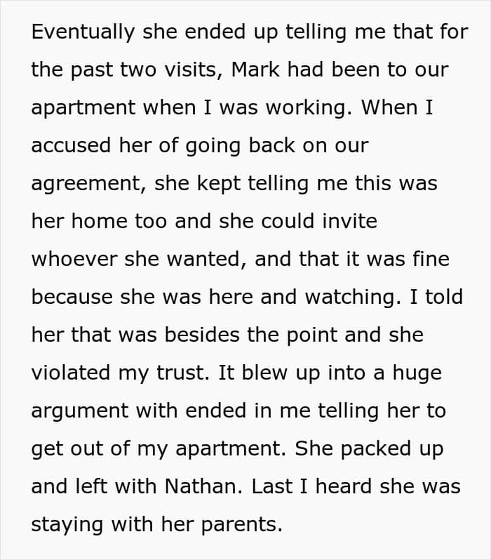 However, when the poster found out that, despite his warnings, Sara had invited Mark over twice secretly behind his back, he kicked her out