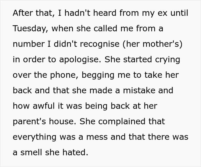 She moved in with her parents, but soon called him, begging him to take her back, as she hated it there, but he refused to budge