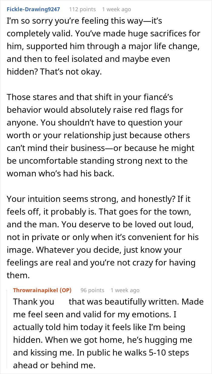 The original poster’s (OP) fiancé also fails to realize this, as she thinks he distances himself from her in public after they move to a new place for his job, just because she’s Black. She suspects he doesn’t want people from his work knowing about her, but later realizes that there’s more to the story!