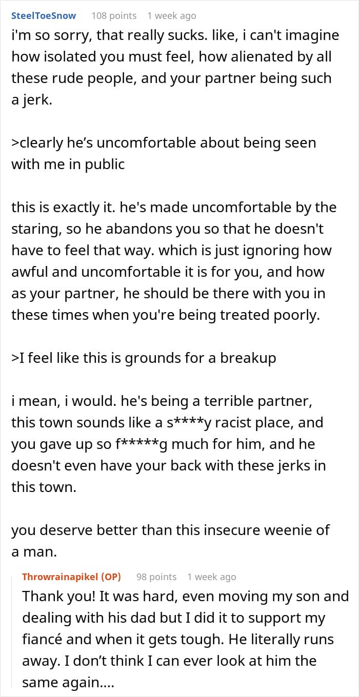 Today, we dive into a quite sensitive story as Reddit user Throwrainapikel narrates her troubles. She helped her fiancé a lot when he was trying to get a new, well-paying job, and even moved far away for it with him, taking her son along. That’s when the trouble began, as she’s Black and her husband is a caucasian, and she realized pretty quickly that the town is racist.