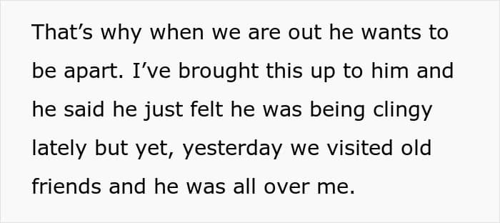She felt he was distancing himself from her in public because he didn’t want people from work to know about her, but later realized something else