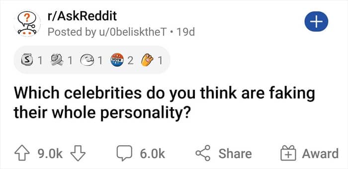 The author of the thread, redditor u/0belisktheT, sparked a discussion after asking people for their thoughts on which celebrities might be “faking their entire personality.” We’ve collected some of the most interesting replies, Pandas, so have a scroll down and read through some of their thoughts and suspicions.