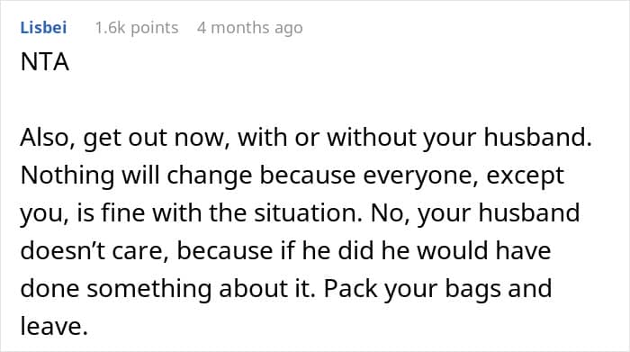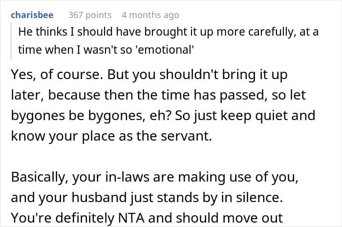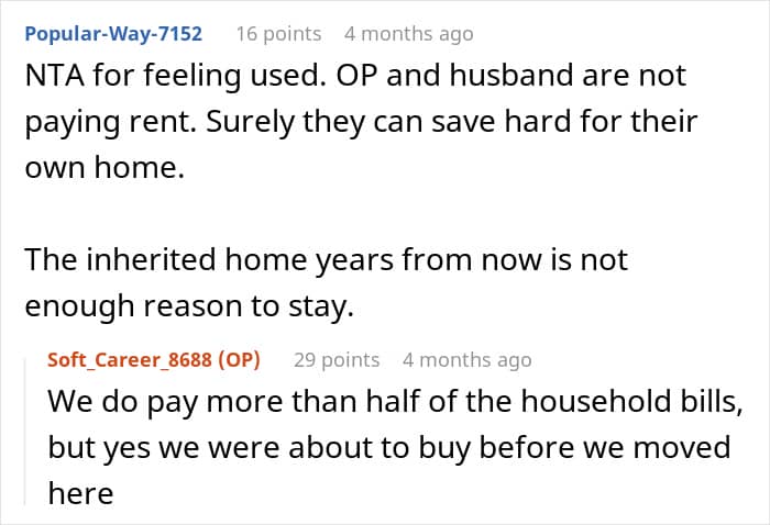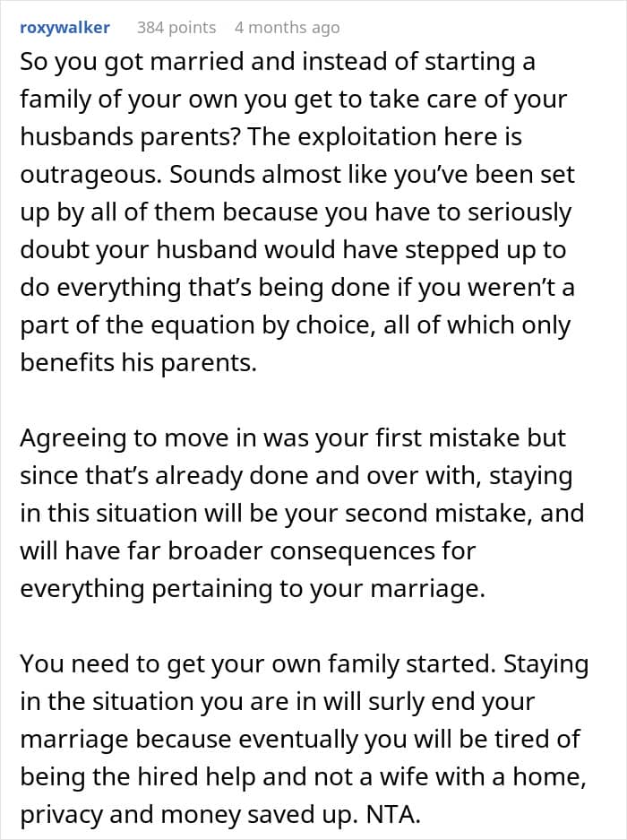 Commenters further pointed out that this arrangement only ever benefited the in-laws and, to some extent, the hubby. The in-laws were getting the best deal as the young’uns were there to pay most of the bills and solve most of their problems, including caring for the dad. They didn’t even have to lift a finger. Neither did the hubby, minus him paying something.