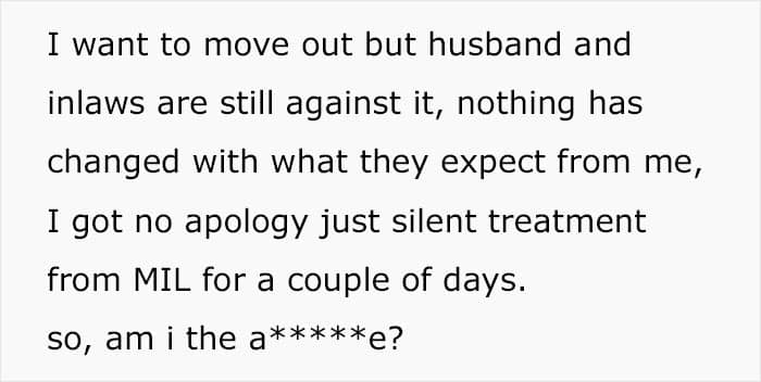 That’s the situation that one internet user found herself in. She turned to the AITA community for help after realizing that her husband’s parents are treating her like a maid because they live together. Eventually, the tension boiled over, and she called everyone in the family out. Scroll down for the full story, including dramatic updates about how the woman tried to reclaim her life.
