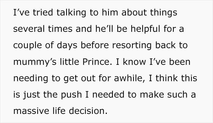 So she packed her bags and left. And when nobody did anything about rectifying this schism in the relationship, the woman distanced herself from them for good, and started the divorce process.