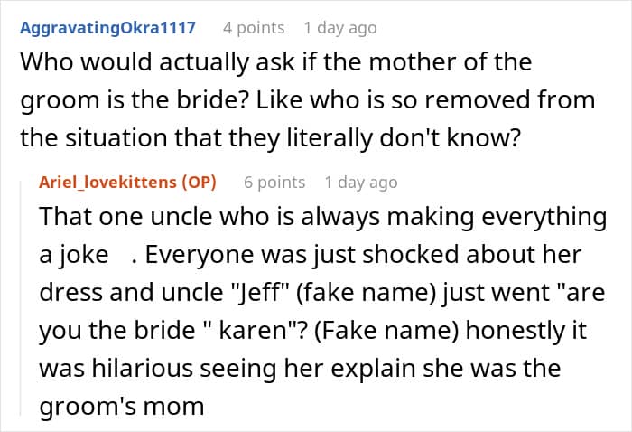 However, something tells me that even if the Redditor told her mother-in-lawexactlywhat to wear, she still would have arrived in something else.