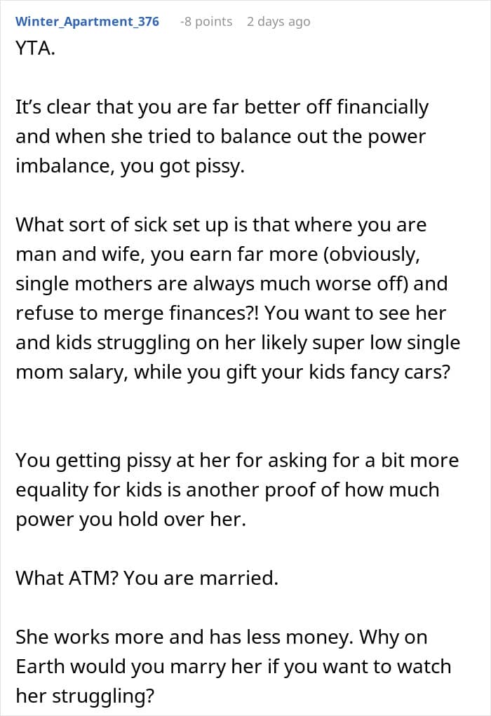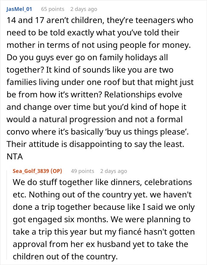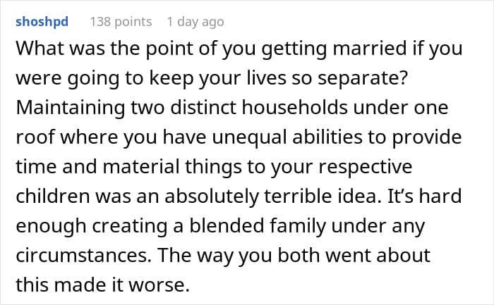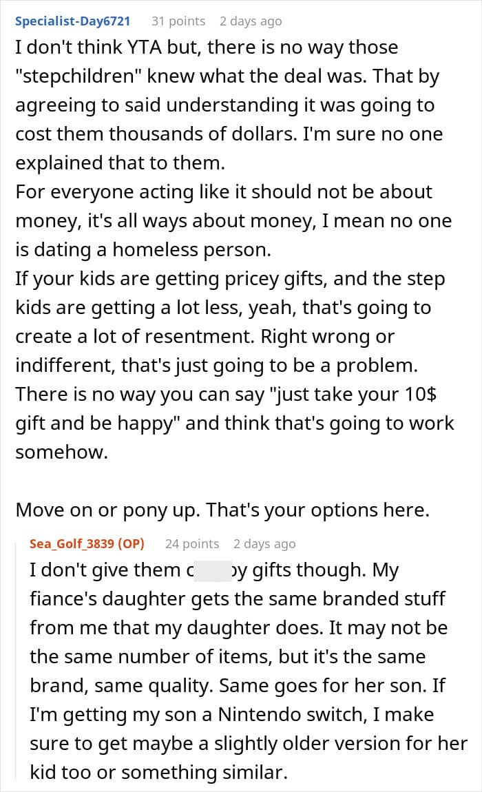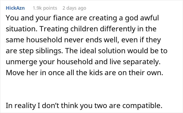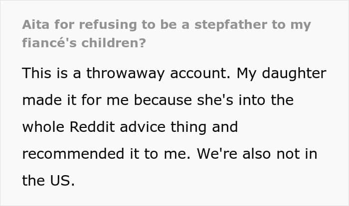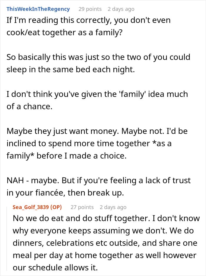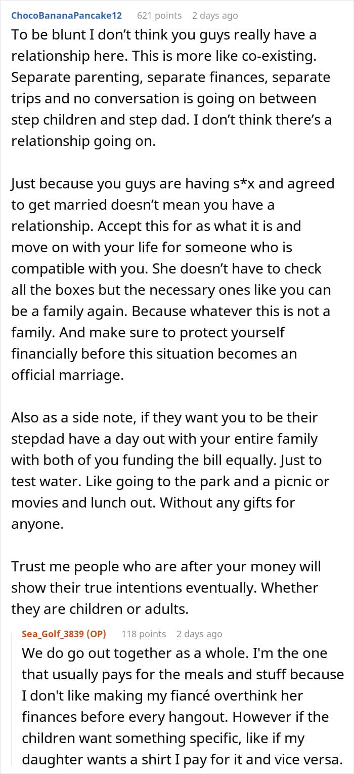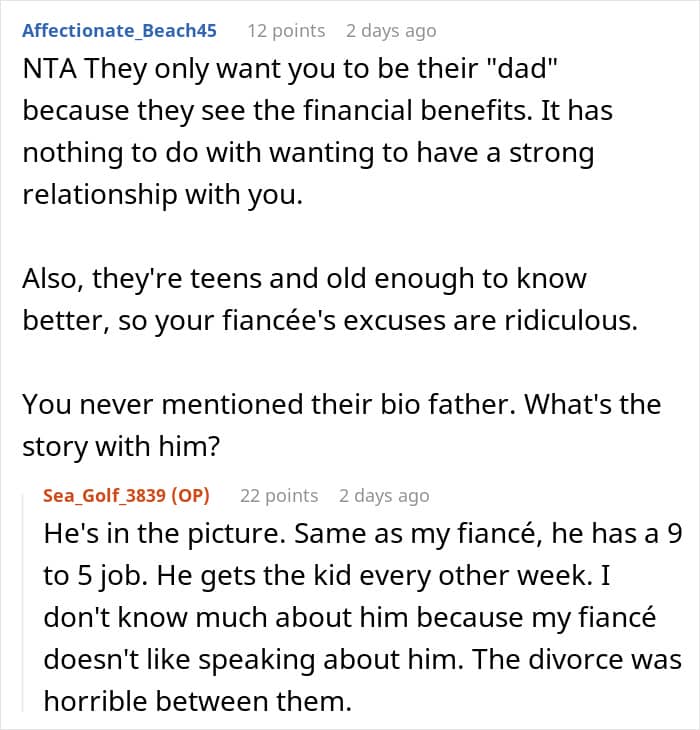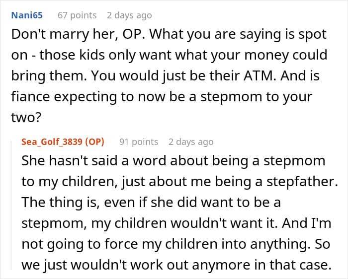 Money both solves and creates problems, and Reddit user Sea_Golf_3839 is experiencing this firsthand. The man claims he and his fiancée had worked out an arrangement that — they believed — would be fair for their kids. He parents his, she takes care of hers, and everyone is happy. Well, after seeing the way he treats his son and daughter, his fiancée’s children told her they want him to become their stepdad. But he suspects ulterior motives and refuses to agree, creating tension in the household.