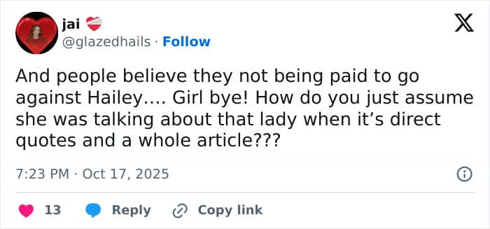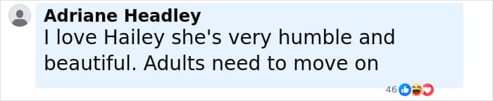 Moments later, Hailey shifted tone and appeared to address the situation more broadly.