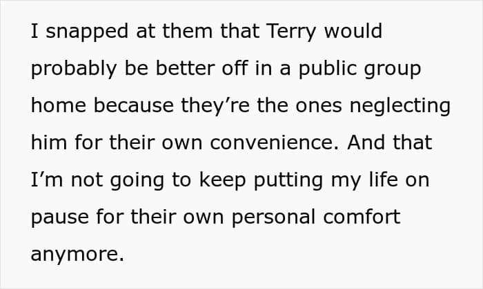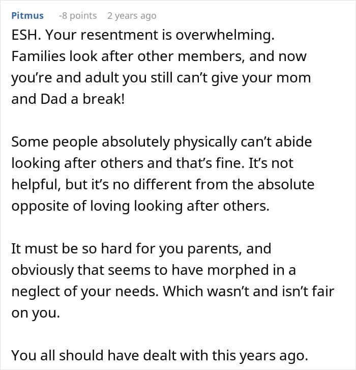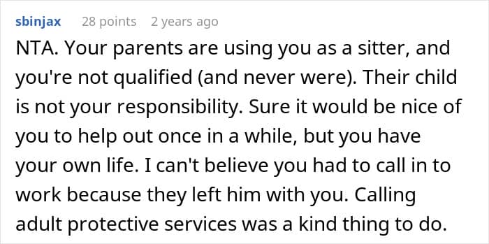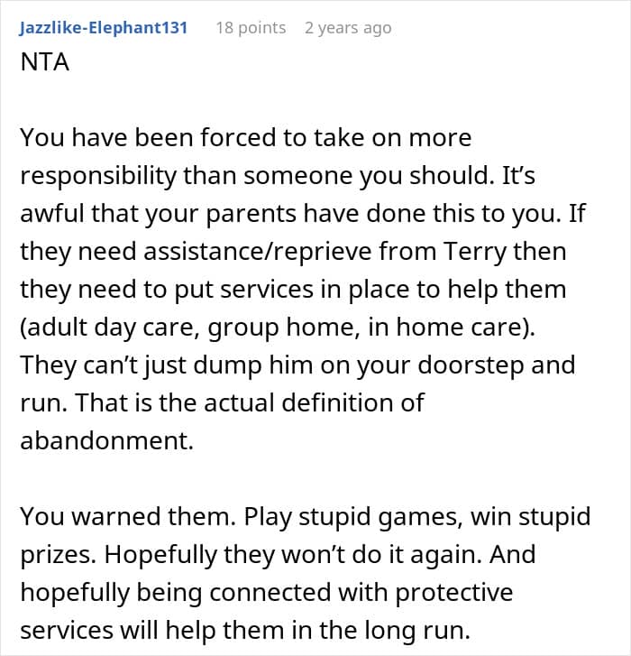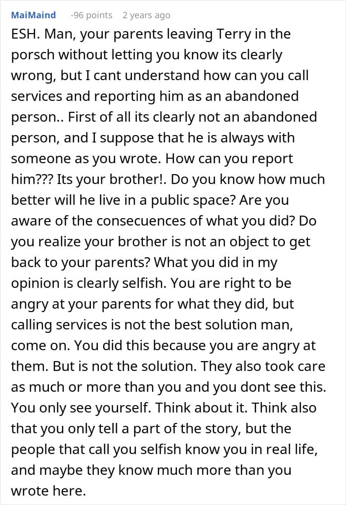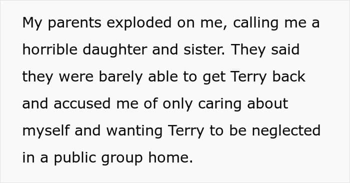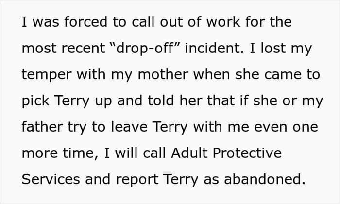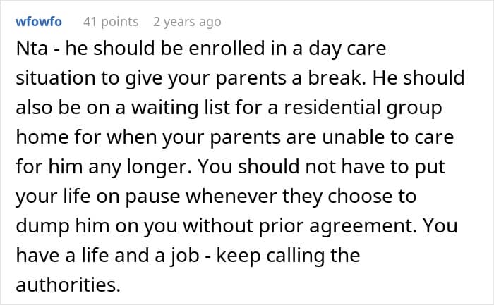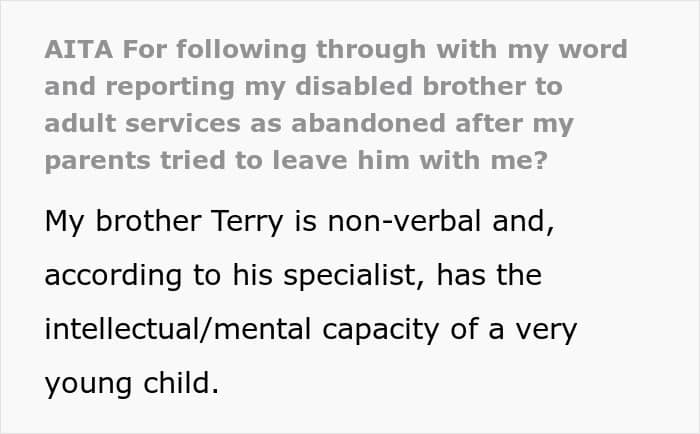 Someone has shared how they’ve been “parentified” since the age of 13, and roped in to take care of their brother. He’s non-verbal and has the mental/intellectual capacity of a young child. Because of his violent meltdowns, his sibling is scared of being alone with him. But their parents don’t seem to care. Things took a wild turn when the sibling decided to call adult protective services and report her brother as abandoned.