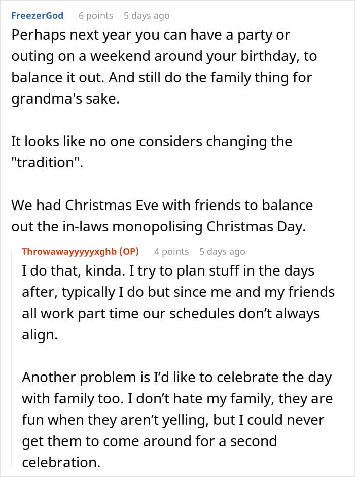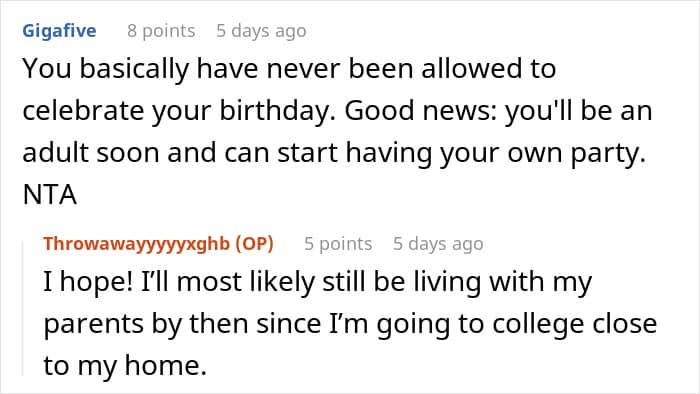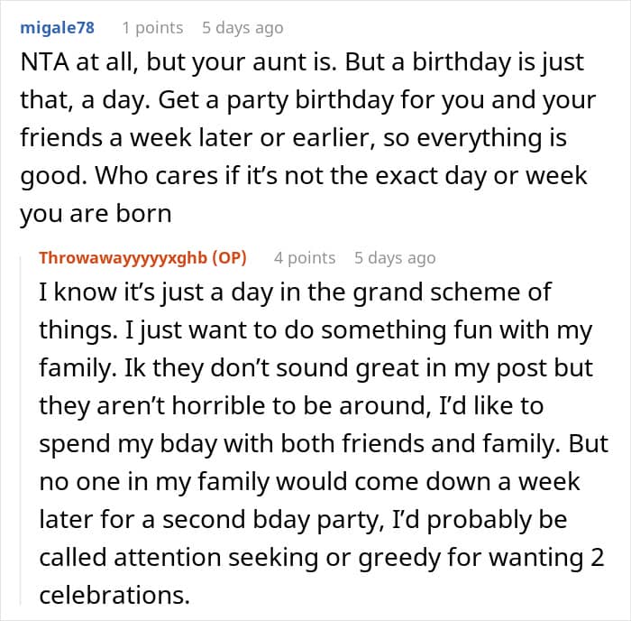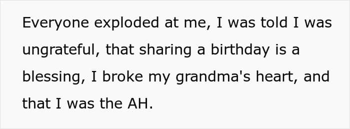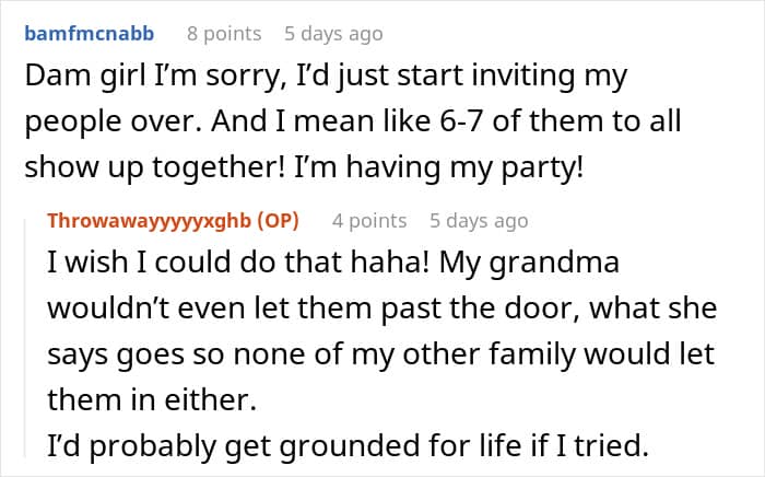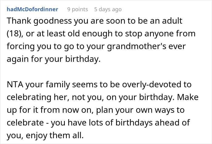 One teen can only dream of such fun. She says she’s forced to have a combined party with her grandmother every single year. But it doesn’t end there. The 17-year-old has no say in the planning. And she’s not allowed to invite any friends. Drama erupted recently when she voiced her unhappiness.