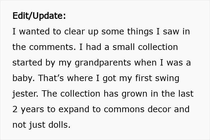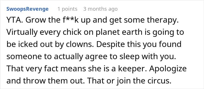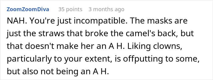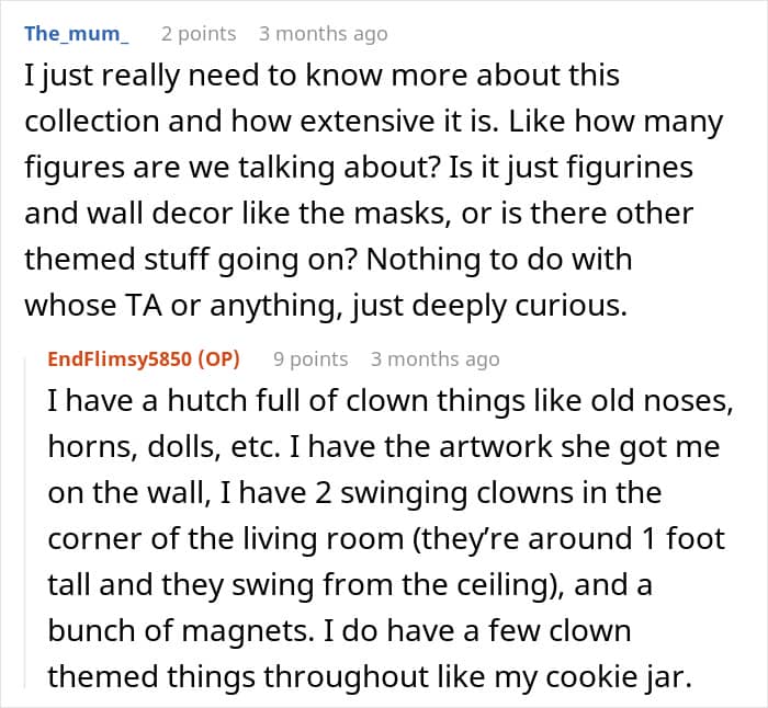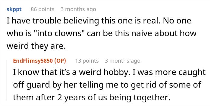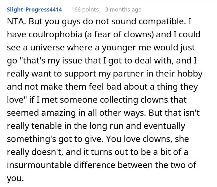 Redditor u/EndFlimsy5850 opened up to the AITA online community about how his girlfriend issued him an ultimatum. She forced him to choose between her and his beloved clown collection, which has been a part of his life since childhood. Scroll down to read how everything played out and to see how the internet reacted to the relationship drama. We has reached out to the author for comment, and we’ll update the article as soon as we hear back from him.