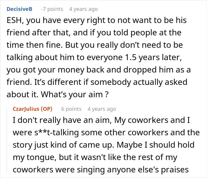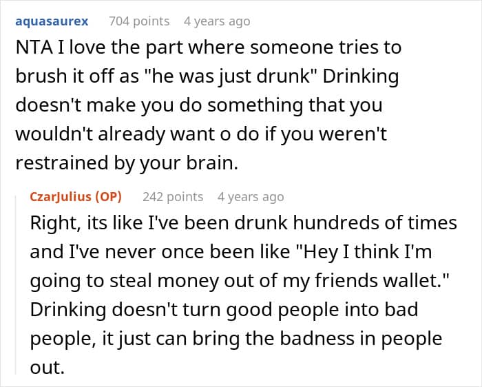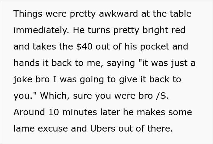 This guy ruined a friendship for a mere $40. After he tried to swipe it from his coworker’s wallet at a bar right in front of him, he doubled down with the classic “It’s just a joke, bro.” Unfortunately, the bro wasn’t amused, and would talk about it to mutuals even years later. Was he being too petty and should’ve let it go by now?