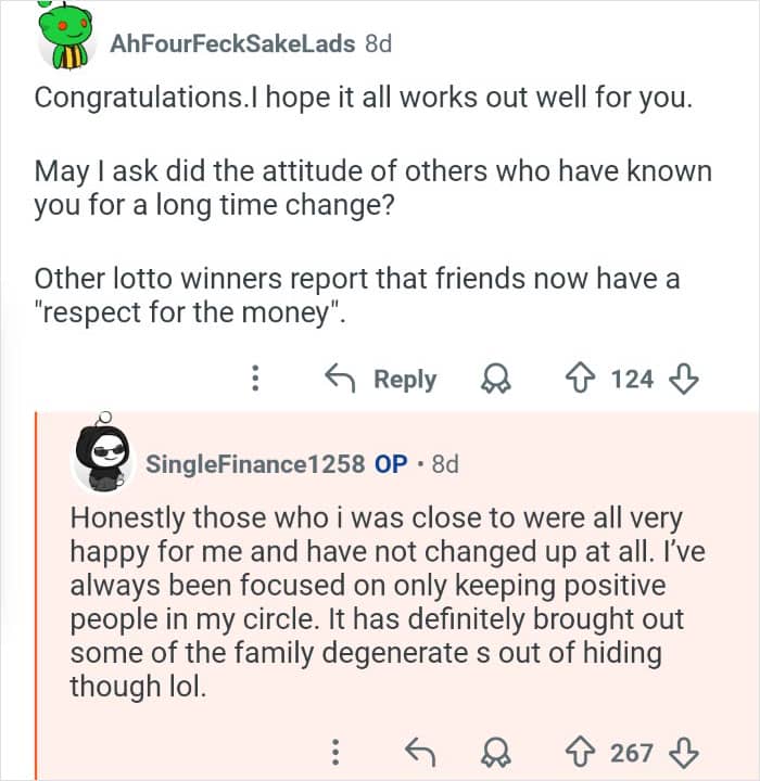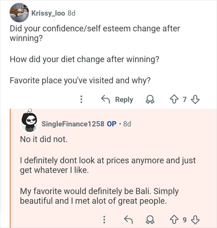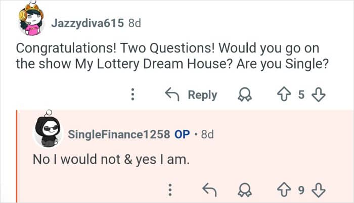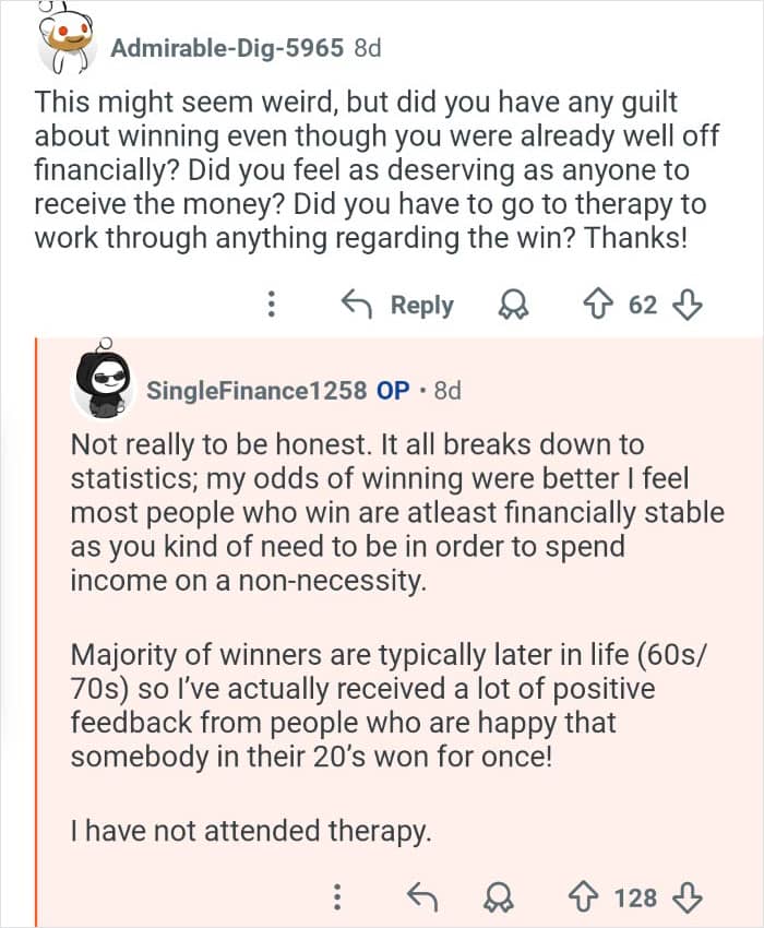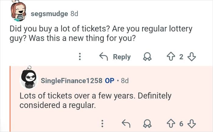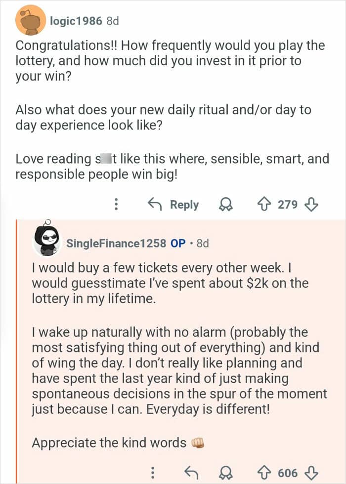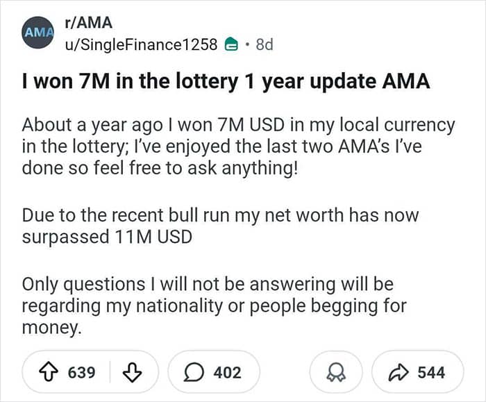One of those lucky people, a netizen under the username u/SingleFinance1258, recently did an “Ask Me Anything” (AMA) on Reddit and shared what life has been like a year after their win. We has compiled the most interesting questions and answers for you to check out and to reject the myth that all lottery winners go bust.