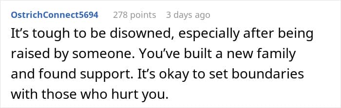 Folks online also applauded her for firmly protecting her boundaries and not letting the man disrupt her life all over again. Friyana also emphasized, “Boundaries are crucial in situations where a parent attempts to re-enter a child’s life after years of abandonment. Establishing clear boundaries helps the child protect their emotional well-being and maintain a sense of control over their relationships.”