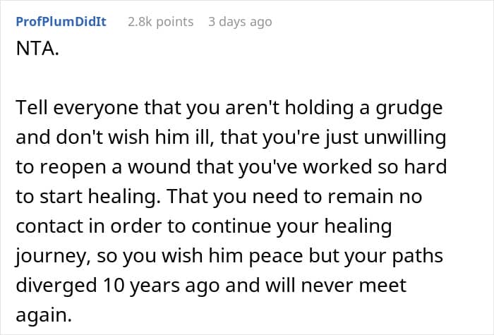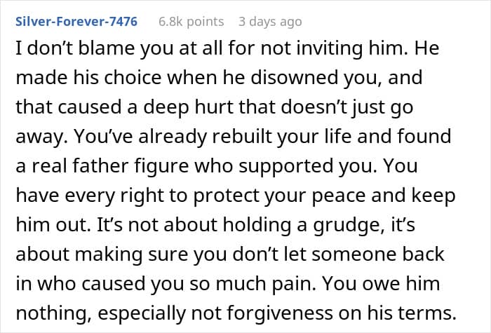 He expected an invitation to the wedding as he wanted to “make things right with her” and apart from her husband, her family was also pushing her to let go of the grudge and reconcile with him. Well, the poster didn’t want to even speak to him, much less forgive him because she felt he couldn’t just pop back into her life after 9.5 years of absence and expect things to be alright.