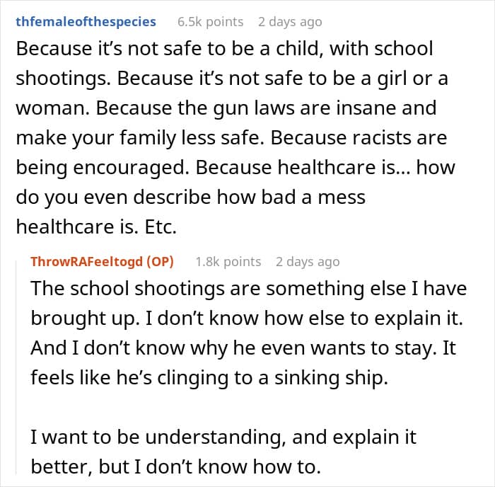 The author has felt uneasy about living in the US for the past three years, which means she has been carrying quite a heavy burden for some time now. As a spouse, the husband should at least hear her out.