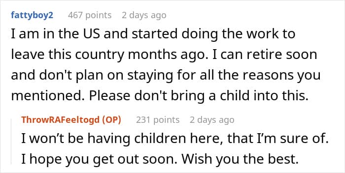 The author of this story is in a similar position in that she refuses to have children in the US. She then gave her husband an ultimatum: either leave the country, go child-free, or divorce. The man seemed offended by the proposal and questioned her motives.