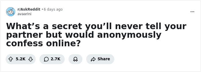 Reddit user Avaarini recently posted a question on the platform, asking those in relationships to use the guise of the internet and reveal anonymously what they’re too afraid to tell their partners. From true feelings towards their relatives to having zero interest in their hobbies, here are some of the most memorable replies.