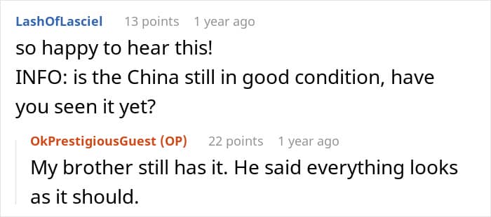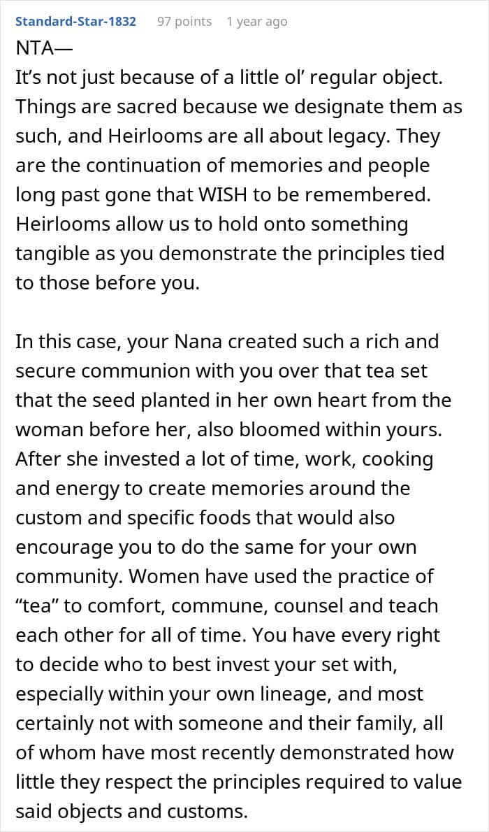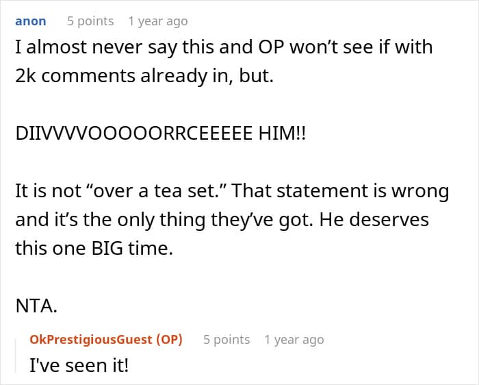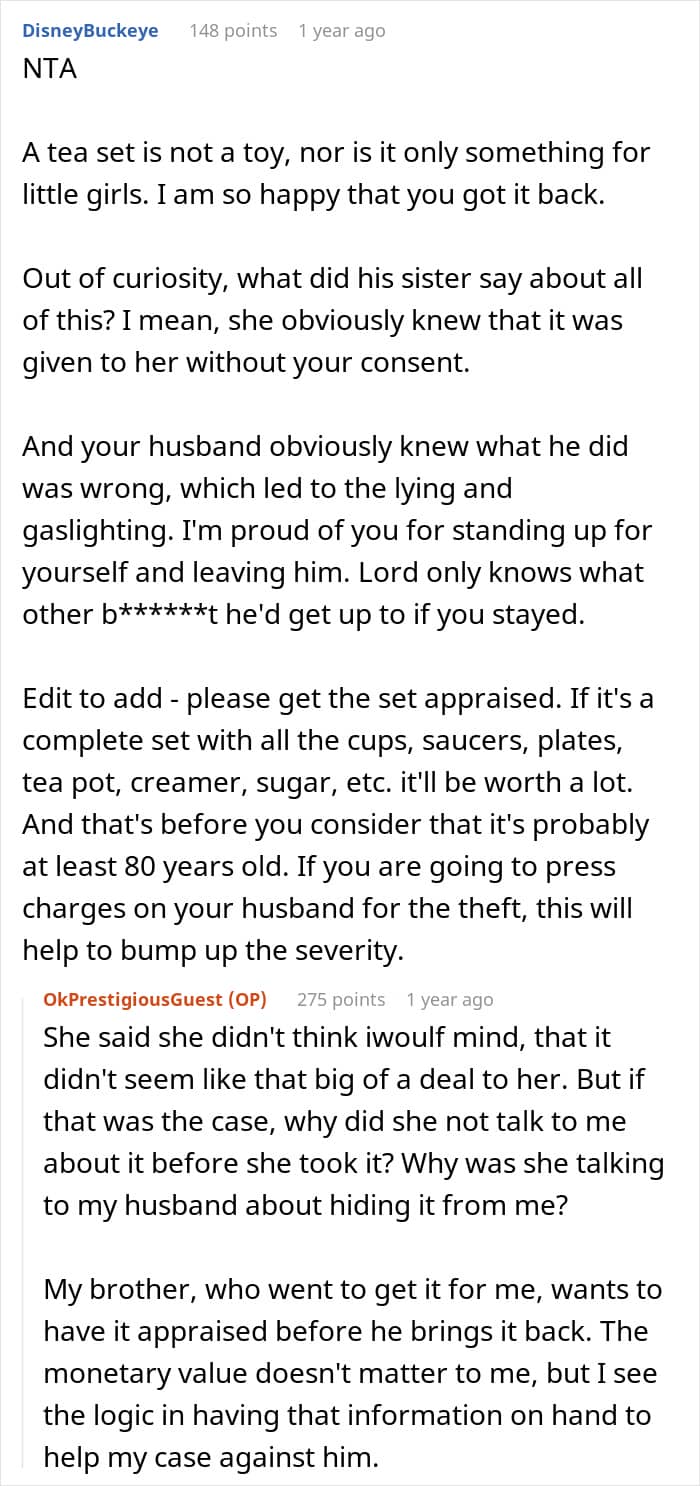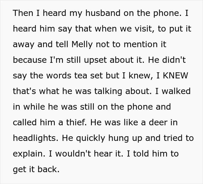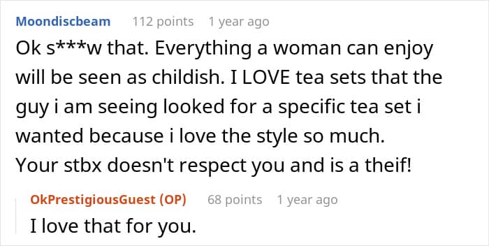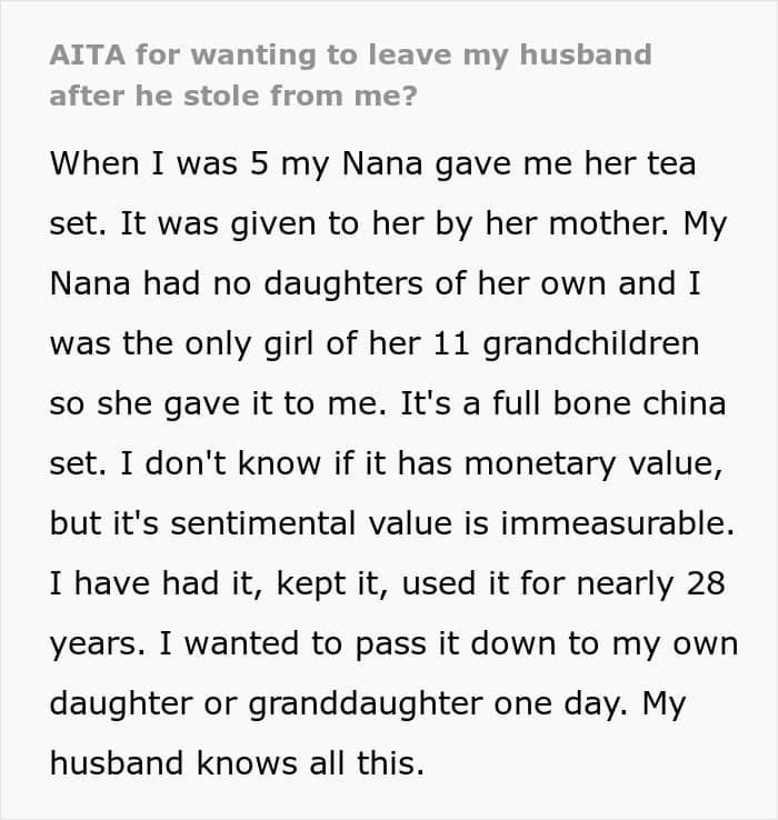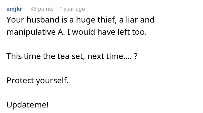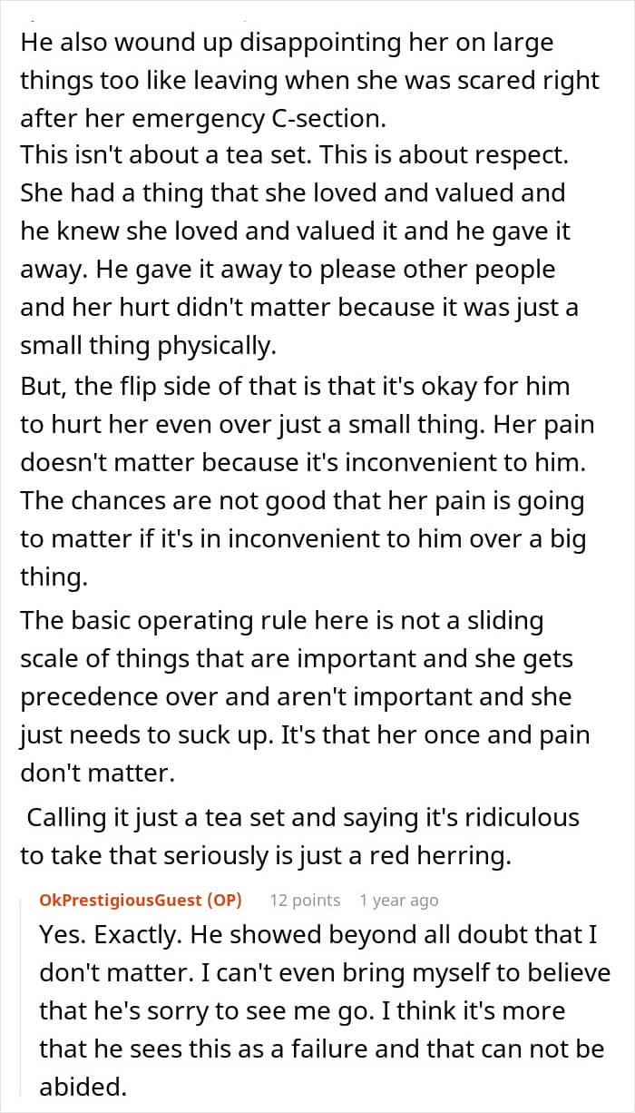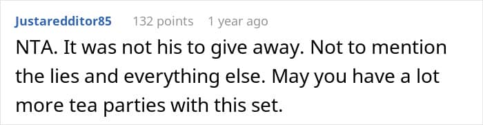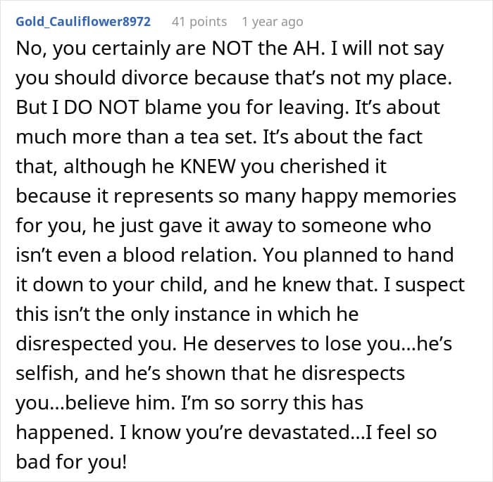 We would love to hear your thoughts on this situation in the comments below, pandas. Do you think this woman made the right choice by ending her marriage over this tea set drama? Feel free to weigh in. Then, you can find another We article discussing similar marital issues right here.