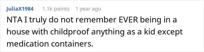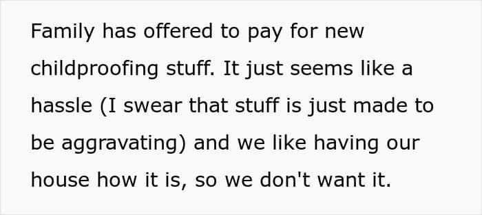Yet, usually babyproofing is installed in the home where the kid lives, but not every place they visit. So, bringing this back to the family from the story, is it really fair for them to expect the OP to childproof their home just for occasional visits?