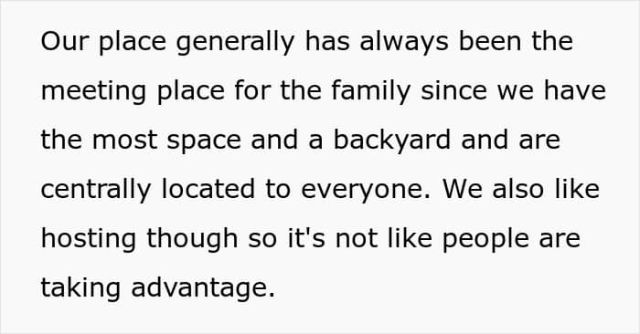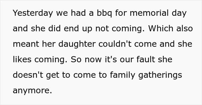 The thing is that their place used to be a designated family hangout spot, but now, since they refuse to accommodate the boy, it’s unclear if it will remain. For instance, they had a BBQ for Memorial Day, but the sister didn’t come, which made the OP a villain in the family’s eyes.