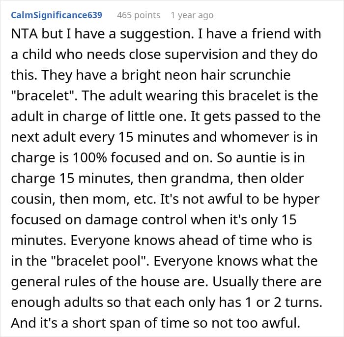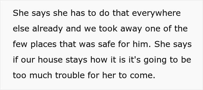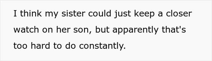 The family thought it was. You see, for the sister, it was simply too hard to keep constant watch on her son, as she has to do that everywhere else, so she hopes for her sibling’s home to be an exception to that. Yet, these words didn’t really sway the OP – they still refused to compromise their own comfort for the occasional convenience of their sister.