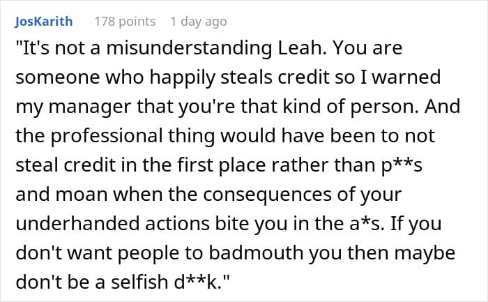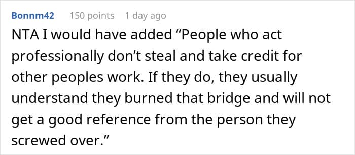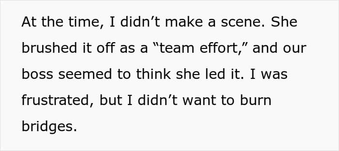 We think OP’s quiet clapback did the job it needed to, right? Here’s hoping Leah learned her lesson and won’t be so quick to claim credit for other people’s hard work in future. Because let’s be honest, nobody likes a thunder thief.